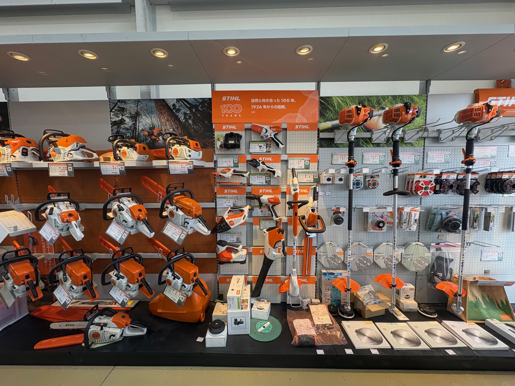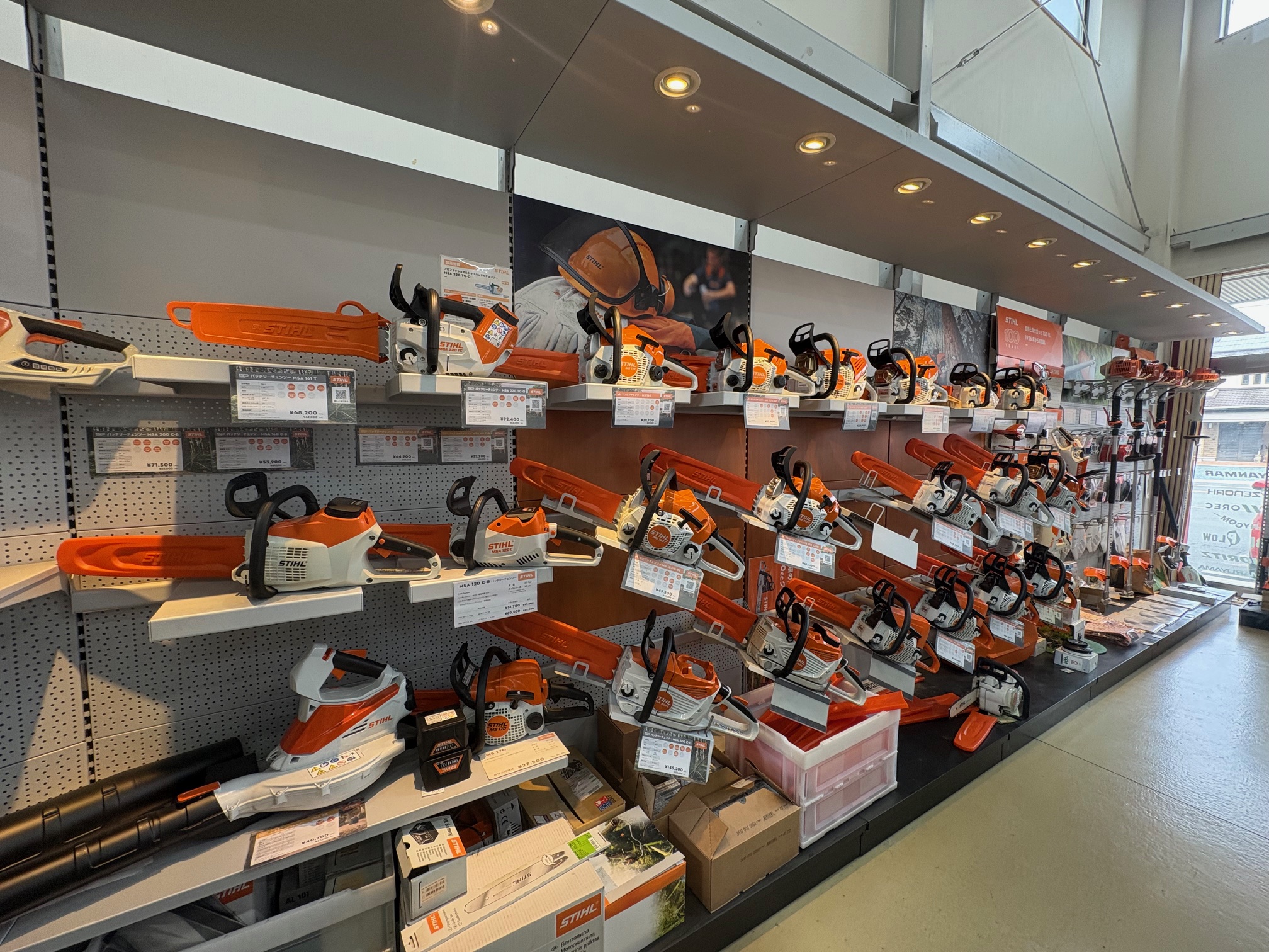 STIHL製品県内最大級の展示。プロモデルから一般ユーザー向けのASシリーズまで展示あります。